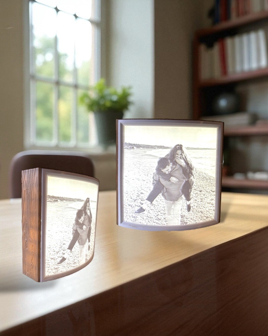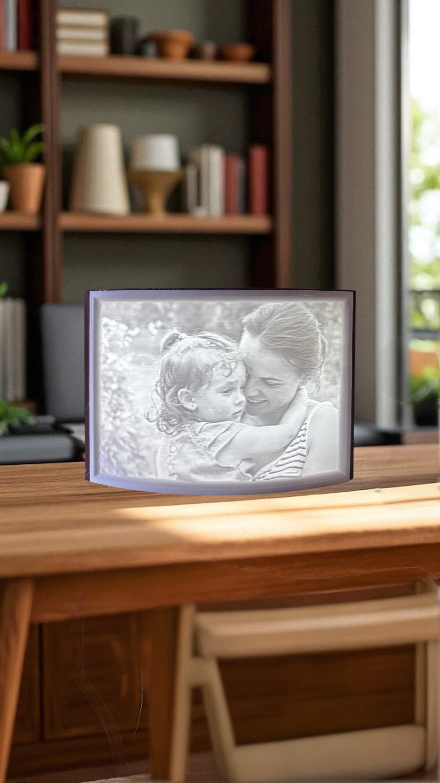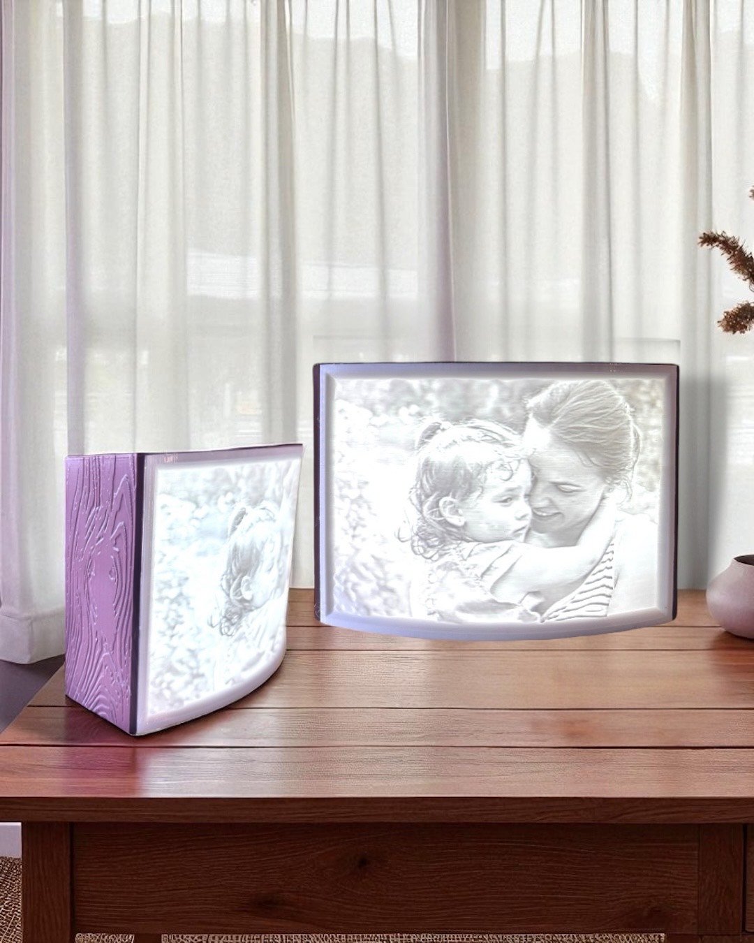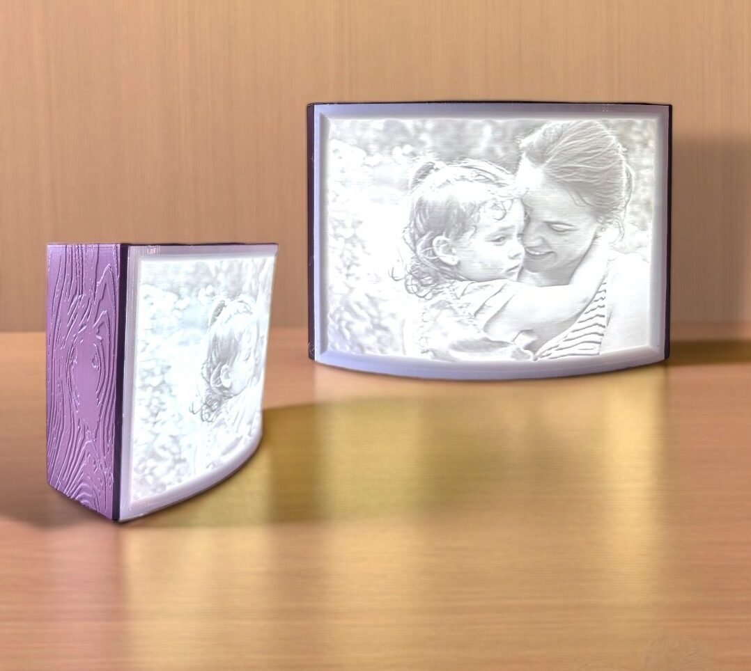 La magia está en la litofanía: una técnica en la que una imagen en relieve se transforma, gracias a la luz, en una proyección llena de profundidad y contraste. Podés personalizar tu lámpara con fotografías, diseños o motivos especiales, convirtiéndola en un objeto único, ideal para regalar o decorar tus espacios con un toque personal.